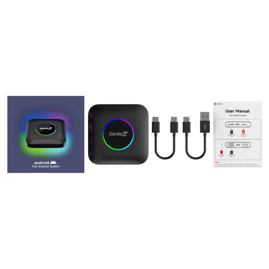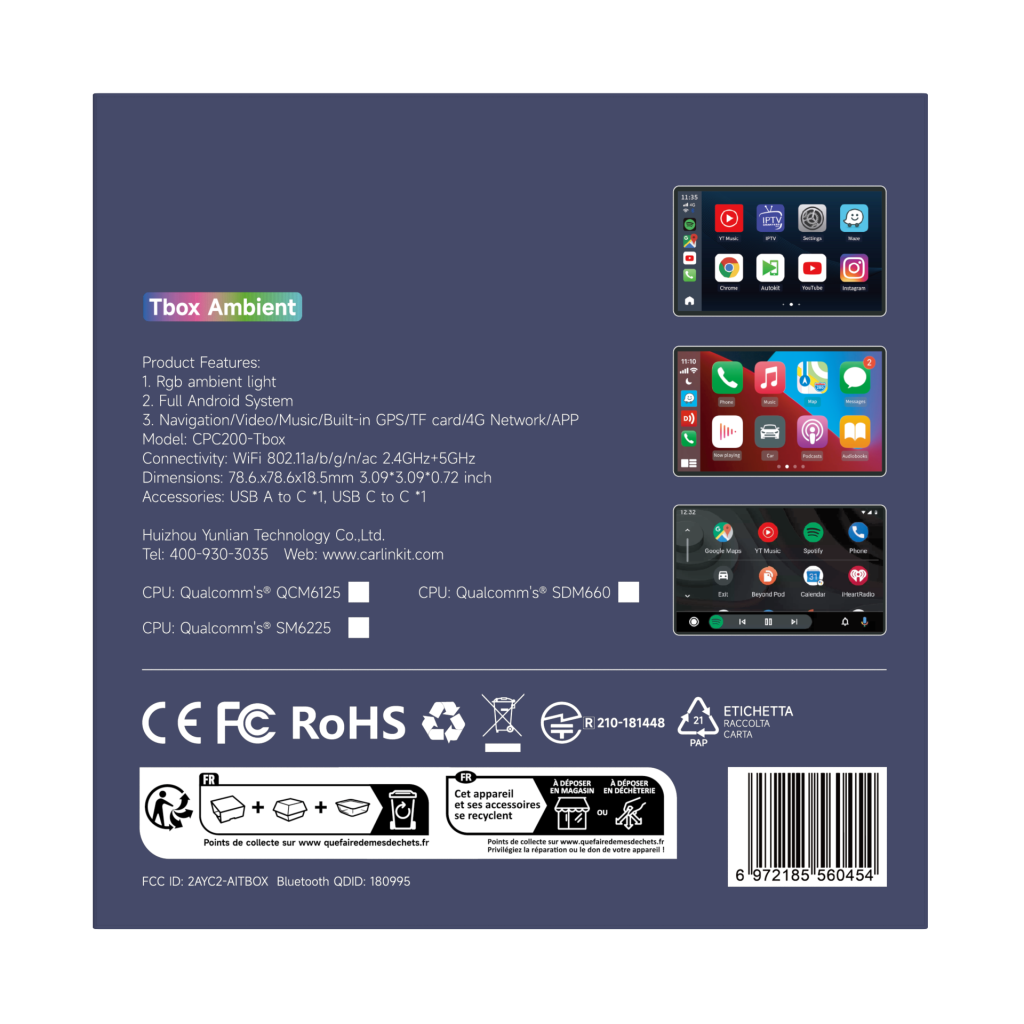 مدلهای CarPlay یا Android Auto سیمی کارخانهای میتوانند از این محصول استفاده کنند؛ CarPlay بیسیم: آیفون ۶ و بالاتر، مدلهای iOS 10 یا بالاتر؛ Android Auto بیسیم: سیستم تلفن همراه اندروید ۱۱.۰ یا بالاتر